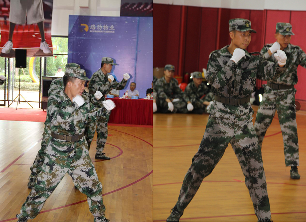 接着秩序维护员们一套擒拿倒功给大家带来了具有冲击力的视觉享受,队员们整齐有序地展示前倒、侧倒、卧倒等动作,充分展示了秩序维护人员不畏疼痛、不畏艰险的面貌,展现了路劲物业人拼搏不息的精神。