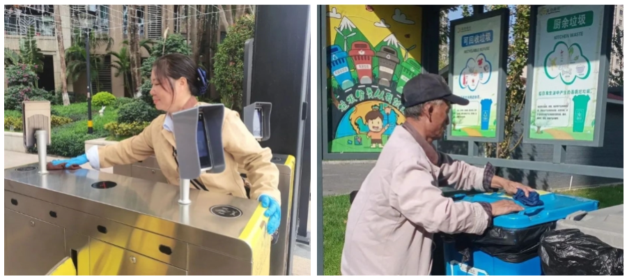大家分工明确,各司其职。有的挥舞着扫帚清扫路面上的杂物;有的拿着垃圾袋穿梭在绿化带中,仔细搜寻落叶与垃圾;还有的拿起抹布,逐楼擦拭各楼层的门窗、电梯、消防设施、楼梯扶手,并将楼道内堆积的杂物清理干净。不放过任何一个卫生死角,从方方面面保持社区环境洁净明亮。